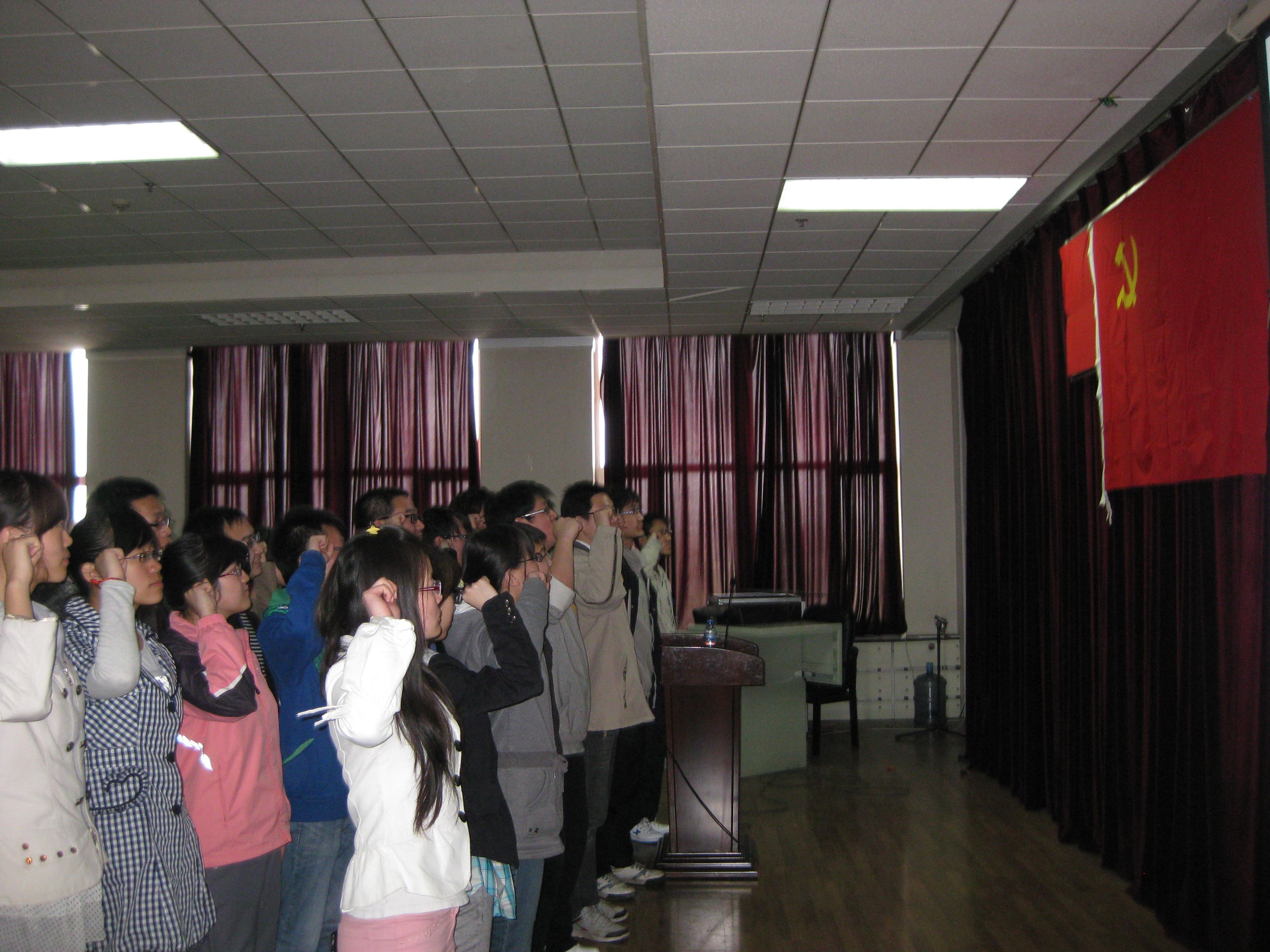 同学们面对党旗,庄严地举起右手,共同重温了入党誓词。那一句句掷地有声的誓词承载着广大党员同志对党的无限忠诚和热爱。学生代表贾龙的发言真切体现出了党员们对于投身社会建设、发挥模范带头作用的坚强信心和无限的热情。李老师最后强调了“重温入党誓词”活动的重要意义,要求广大党员同志始终牢记自己的党员身份,无论是工作和学习,都要以党员的标准严格要求自己,在自身积极努力创造优秀业绩的同时,更要发挥党员先锋模范作用,带动和帮助身边的群众,共同进步,为实现中华民族的伟大复兴,为中国梦而共同努力奋斗!